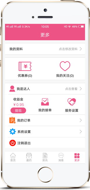 用戶也能自己申請為達人,為其他用戶提供服務,獲得收益金。在平臺進行下單、接單操作,無須出門就能找到客戶、專業工作人員,來進行上門服務或在線服務。